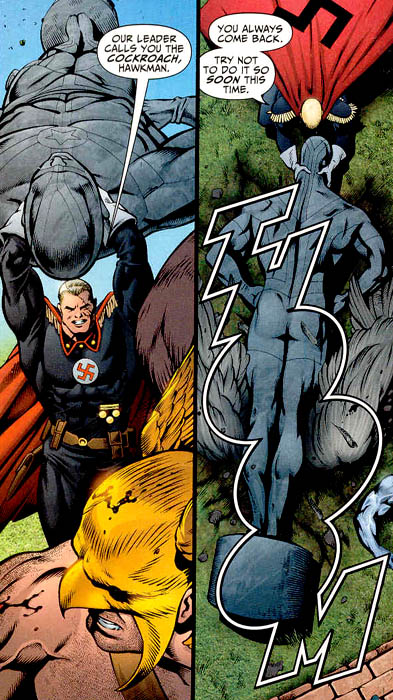 That’s actually pretty cool for Alex, and makes you want to learn to draw well so you, too, can get the acclaim, the cash and your face immortalized in ink. I know *I* wouldn’t mind having a superhero who looks like me (other than Herbie Popnecker, I mean) but I don’t know if I’ll ever have the kind of influence that Alex has in the industry. Bygones… As Reichsmark falls at the hands of the just-in-time Hawkman, Captain Nazi (presumably NOT the one that Jason Todd killed) swoops in, grabbing the statue of Commander Steel that the Heywoods have as their reunion centerpiece…