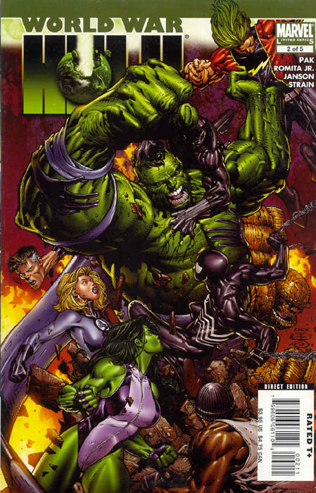 Romita’s art is highly stylized and I can appreciate that it doesn’t appeal to everyone. I have to admit he wouldn’t have been my first choice for this particular book either. That said, he’s undisputedly one of the best artists in the industry. Also consider the history Romita brings to the table. His father practically invented the modern day look of the Hulk that we all know and love and his style is very reminiscent of classic Kirby. Very appropriate for such an epic storyline. But what everyone should realize and appreciate about the man is his work ethic. He always delivers excellent quality and quantity. He not only draws well, he draws like the wind. How many times have you started a great story like this only to be disappointed by constant delays? So far, I think Romita has outdone himself. And hit for hit, some of the best fight scenes I’ve seen in a long while.