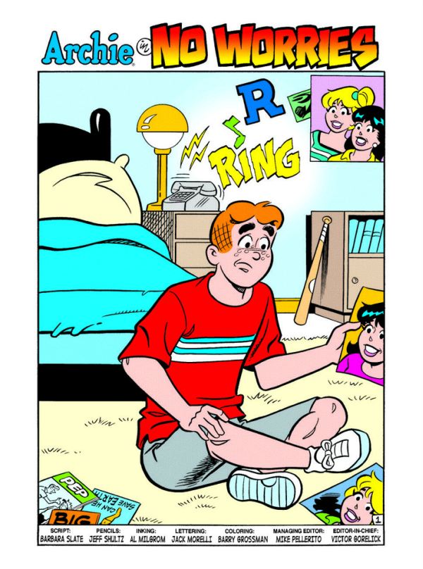 “No Worriesâ€: Archie doesn’t have a single worry – he has a double worry, namely whether to choose Betty or Veronica! The “eternal love triangle†lives up its billing as an ad infinitum entanglement!