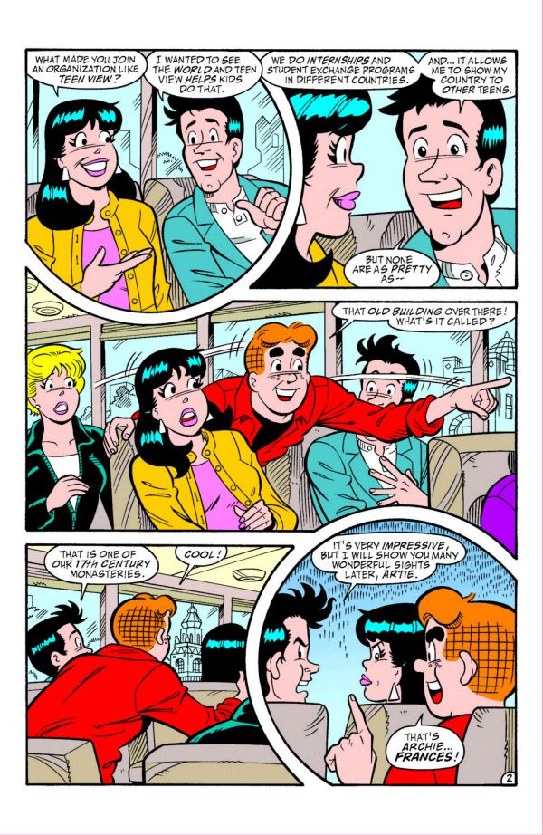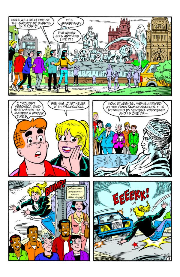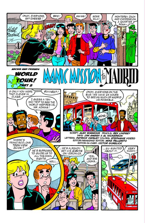 “Archie World Tour Part 2 of 4â€: Having barely escaped with their lives in the previous issue’s trip to London, Archie and his friends are looking for a more traditional vacation spot… a place filled with history and romance… and Madrid, Spain is just the place! The key word is romance, as Veronica and Betty are wooed by their teen guide, leaving Archie feeling whoa-ed. Even Ms. Grundy becomes the object of someone’s affection! But mystery and danger make a handsome couple too, as the villain they’ve been evading continues to pursue them from the city to the country. A meeting with a beautiful mystery woman provides Archie with his first clue… and a “first date” with a herd of angry bulls! The mystery continues to deepen and Archie must figure out what is going on before things get really dangerous! Acclaimed writer, children’s art advocate, and organizer of the world’s only “Kids Comics†convention, Alex Simmons, returns to handle the script chores, while fan-favorite Rex Lindsey is back with some of the best art of his career. It all adds up to one world tour you won’t want to miss!