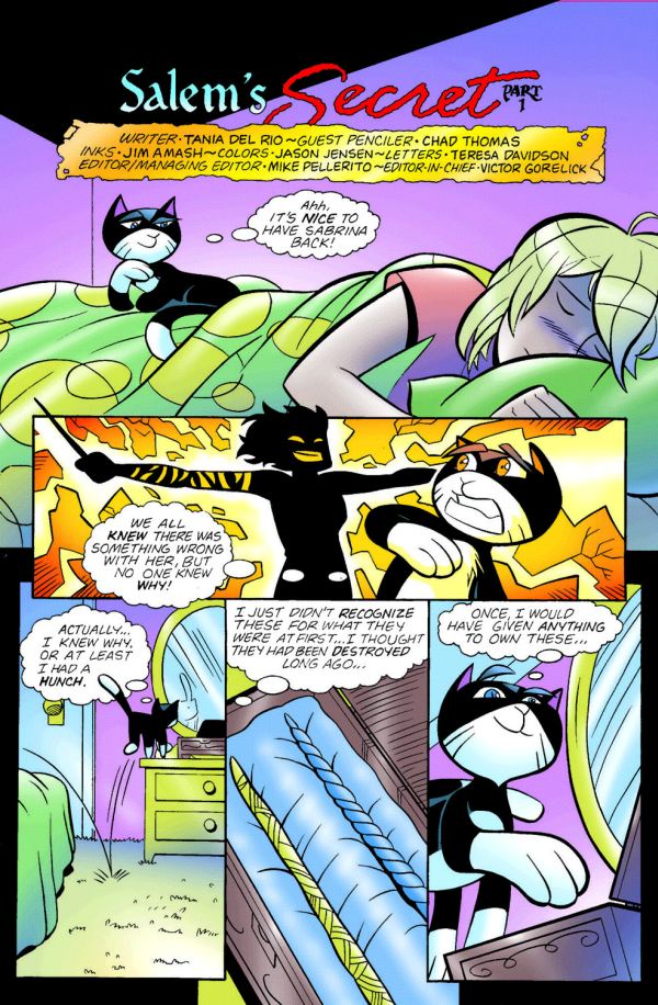“Salem’s Secret Part 1â€: Sabrina’s loyal cat Salem is more than you might realize. Salem was a warlock who once tried to take over that the Magic Realm. His punishment was to spend the rest of his life as a cat. For the first time ever we will learn just what Salem did to earn this unique magical punishment…. and what he did in the aftermath that affects Sabrina to this day, especially after her recent battle to become good again! For the first time in the history of the manga Sabrina series, a guest artist is featured: Chad Thomas takes on the penciling chores to tell the story of Salem’s hidden past!