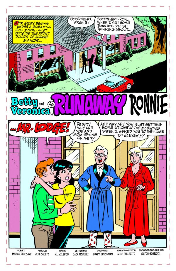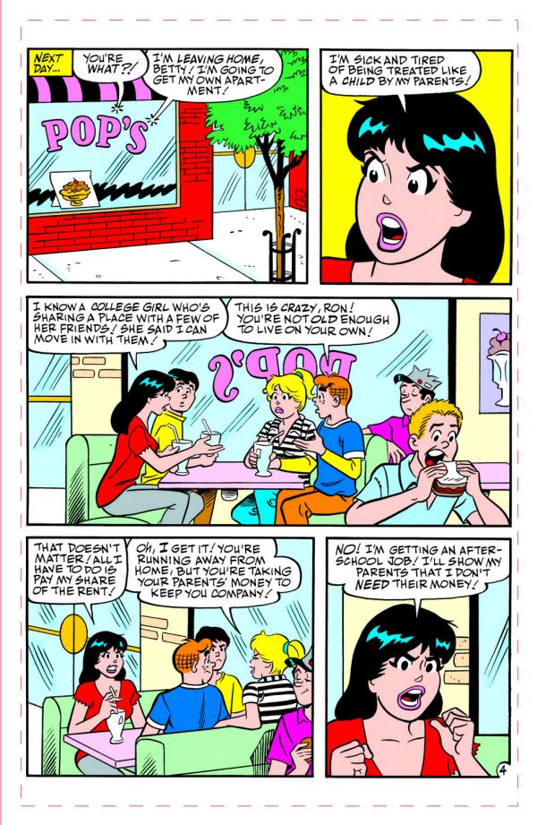 “Runaway Ronnieâ€: In serious trouble with her parents for blowing a curfew and other responsibilities, Veronica longs for freedom… and gets it, when she leaves home to live in an apartment and takes on an… egads… part-time job! Will Veronica’s bid for independence truly give her the “freedom†she seeks, or will she learn that nothing comes free? Will the love of her parents win out as they miss their only daughter? How will Veronica’s friends react to the news?