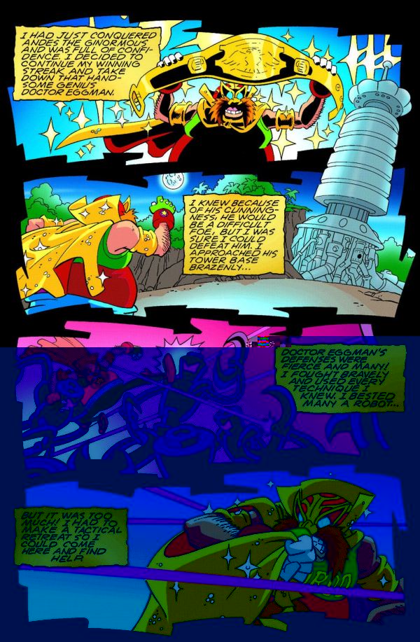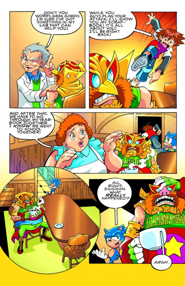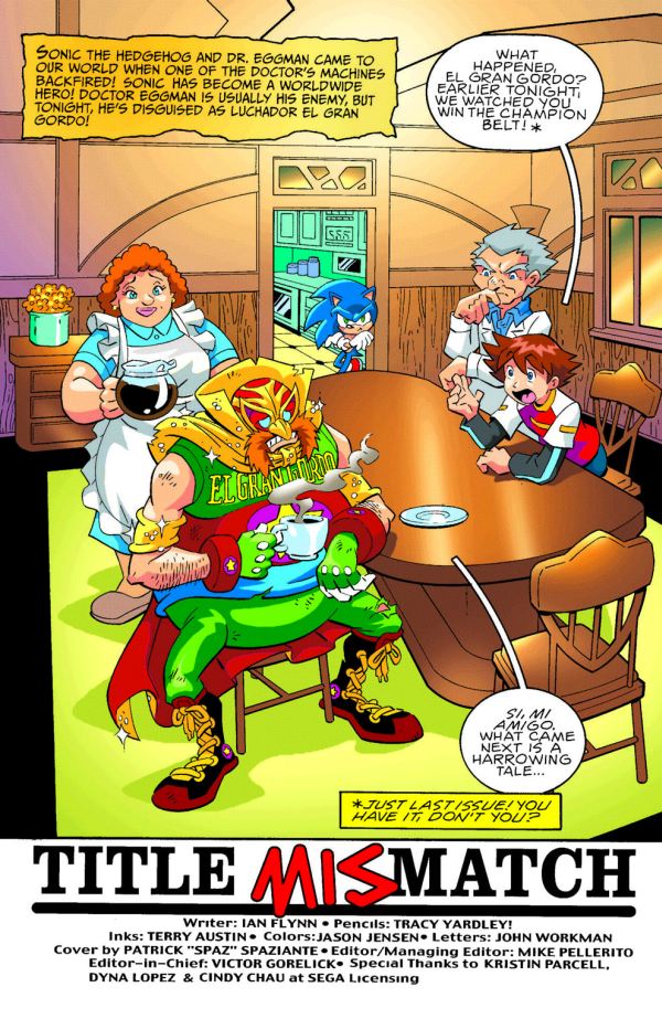 “Title Mismatchâ€: It’s tag-team trauma for Eggman! When Eggman finds himself an outsider in his own evil Empire, a team-up of unimaginable proportions takes place. El Gran Gordo and El Rapido Azule, the masked wrestling sensation must band together to save all of Station Square! Will this team be a slam or will this all end in a tag out?! Get ready to rumble in this much talked about new issue of Sonic X!