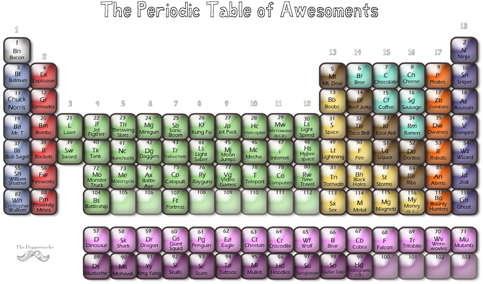Modern day awesominers know there are actually 118 fundamental “awesoments” that compose all good things. The Periodic table of Awesoments can be a very useful tool. It’s designed to show the relationships between awesoments, and often one can even predict how awesoments interact simply by their positions on the table.
