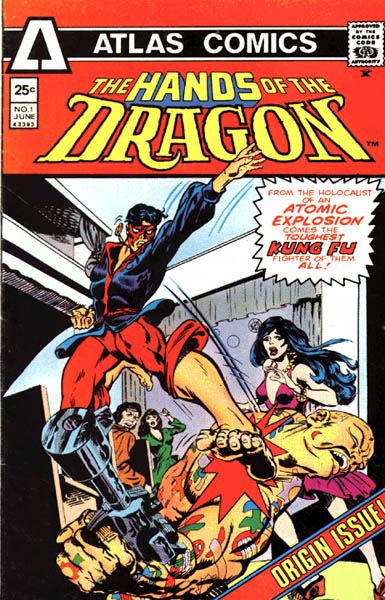 Hands Of The Dragon #1: “From the holocaust of an atomic explosion comes the toughest Kung Fu fighter of them all!” Comics are full of high-kicking heroes these days, with Iron Fist, Shang Chi, Richard Dragon, the Sons of The Tiger and others, and where there’s a trend, there’s Atlas to mine it. This is a stronger outing that some of their other books (notably better than Destructor or The Brute) with interesting art that reminds me of Ernie Colon (which is a very good thing.) We start with the origin of The Dragon (twin babies being carried by an old man to a monastery are irradiated by a leftover atomic bomb form WWII) and his brother The Cobra, then cut to the present day when the Dragon works as an anchorman for the local news. He finds proof that his brother is in town, and suits up to fight injustice. There’s a bad guy called “Doctor Nhu” in here, as well as some freaky tattoos, but overall it’s a vaguely forgettable story merging elements of Supreman’s secret identity with David Carradine in Kung Fu that might be worth a look depending on where it goes. Given Atlas’ tendency to rework a book completely by the third issue, who knows WHAT this could turn into? 1 star.