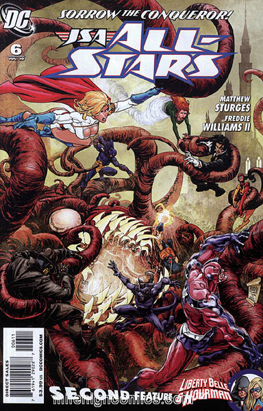 JSA All-Stars #6: The mysterious mystic girl who arrived last issue fights alongside the All-Stars in the alternate univers against Johnny Sorrow. Atom-Smasher’s nascent relationship with Stargirl goes by the wayside and things are really unclear overall. This issue also has some foreshadowing of the Blackest Night stories that happened 3 months ago, as next issue promises to deal with the death of Damage during that series. I’m a little bit irritable about this situation, as Damage’s current character arc came because he was considered to be fair game for crossover murder during Infinite Crisis, and now he’s a casualty of the current crossover. I really am bothered by this situation, mostly because of the resurrections that came at the end of Blackest Night smacking heavily of favoritism… Still, depending on how this is handled, it could be interesting in the long run, but my general feeling is that this arc has run about an issue too long without telling me what’s going on, and now that it’s over, I don’t entirely remember what happened to kick it off. 2 stars.
