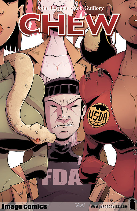 Previously in Chew: Flaming letters have appeared across the sky and the FDA has made these their number one priority. Enter Tony Chu, the cibopath, and John Colby, the cyborg. They have recently taken down a food fight murderer at the Tony’s daughter’s school, and are now being sent on one deadly assignment after another.