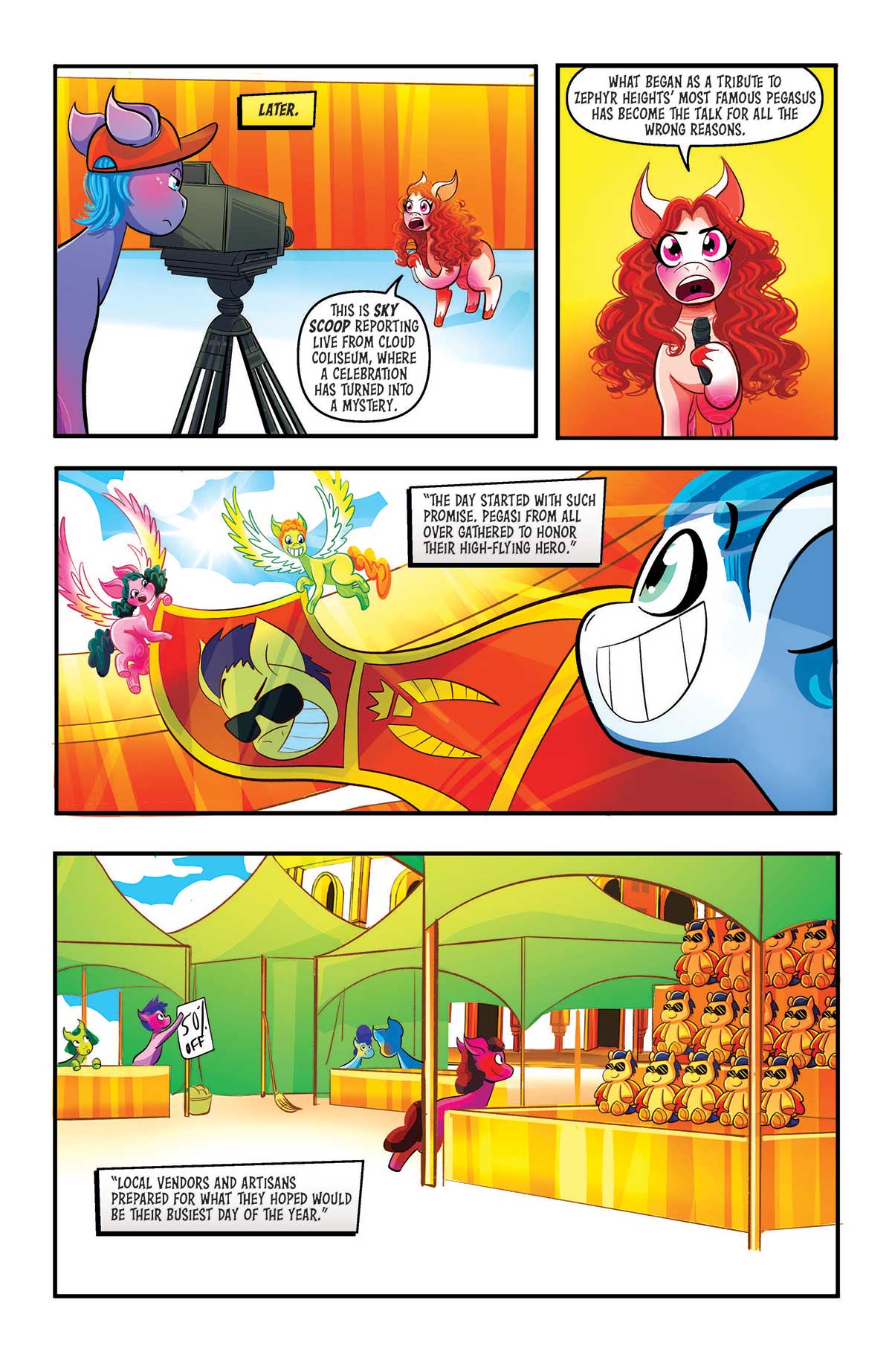When a renowned Pegasus returns to Zephyr Heights for a high-flying tournament in his honor, everything seems to be going well…until his sudden disappearance!In this whodunnit, everypony has a different version of what actually happened, but only when they’re fully pieced together can we unravel this mystery! Look for clues along with your favorite characters and figure out what happened to the vanishing Pegasus in this oversized one-shot!