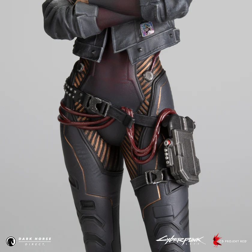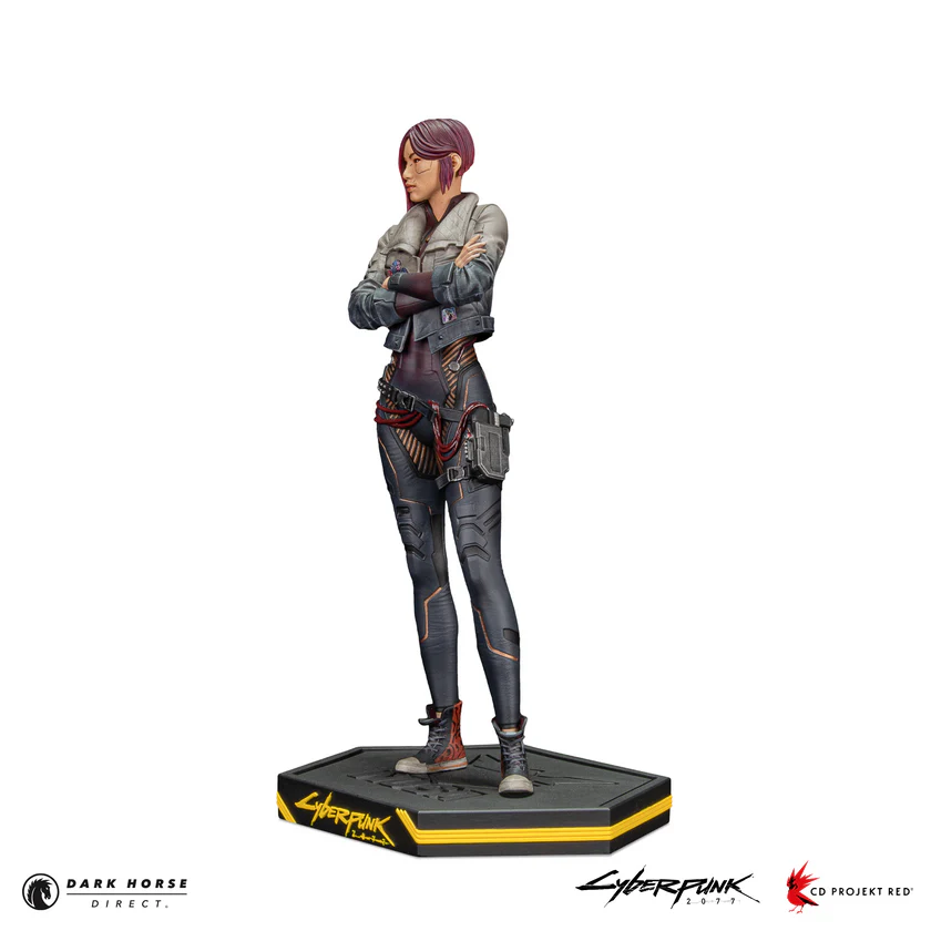 Standing at 9 inches tall atop an NUSA emblem base, this collectible captures Songbird’s signature look, featuring her denim jacket, holstered cyberdeck, and distinctive cyberware facial markings.